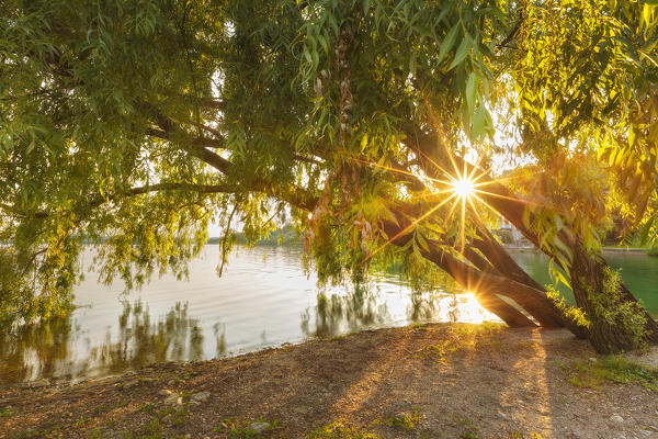 Salix Babylonica (Weeping Willow) at sunset, lake Pusiano, Pusiano, Como province, Brianza, Lombardy, Italy, Europe