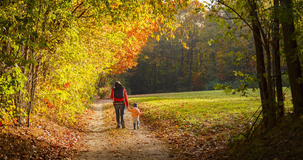 Mother with daughter on her shoulder walks along woods of the Intelvi valley, Lanzo d'Intelvi, Como province, Lombardy, Italy, Europe (MR)