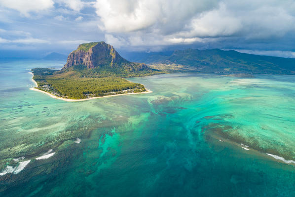 Aerial view of Le Morne Brabant peninsula and the Underwater Waterfall. Le Morne, Black River (Riviere Noir), West coast, Mauritius, Africa