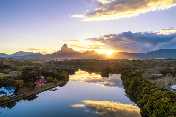 Aerial view of Tamarin bay with Rempart mountain in the background, during the sunrise. Tamarin, Black River (Riviere Noire), West coast, Mauritius, Africa