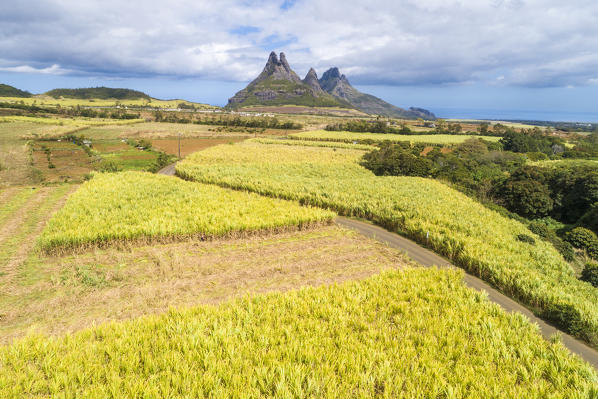 Aerial view of sugarcanes plantations with Rempart mountain and Trois mamelles mountain. Tamarin, Black River (Riviere Noire), West coast, Mauritius, Africa