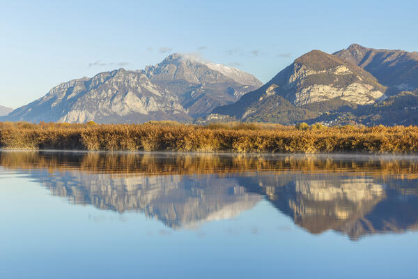 Sunrise on Grigna and Coltignone mount from Adda river, Airuno, Brianza, Lecco province, Lombardy, Italy, Europe