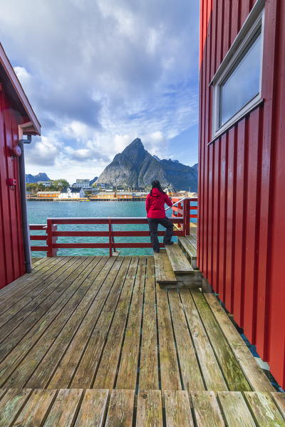 Woman on wooden deck look towards Sakrisoy and Olstinden mountain, Reine, Nordland, Lofoten Islands, Norway