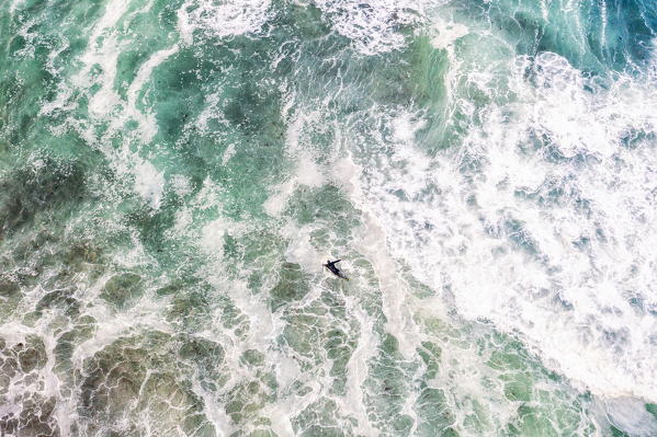Elevated view of surfer paddling into the waves, Unstad, Vestvagoy, Lofoten Islands, Norway