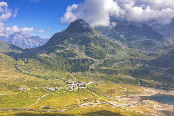 Lake Montespluga and village seen from Monte Cardine, Spluga Valley, Chiavenna Valley, Sondrio, Valtellina, Lombardy, Italy