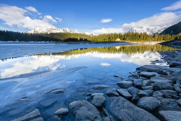 Sunrise over Lake Palù partially frozen during thaw, Malenco Valley, Sondrio province, Valtellina, Lombardy, Italy