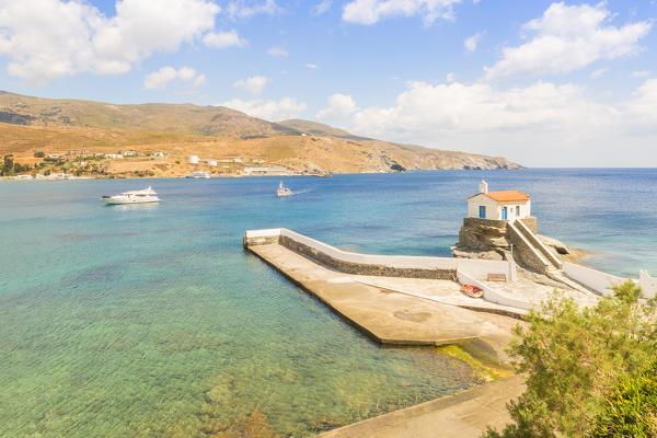 A woman in a blue dress coming down the stair of Andros Village, Andros, Cyclades archipelago, Greece, Europe