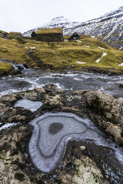 Ice inside the rock formations around Saksun, Streymoy island, Faroe Islands, Denmark