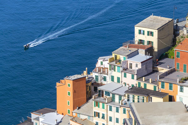 Motorboat in transit in Riomaggiore, Cinque Terre, Liguria, Italy, Europe.