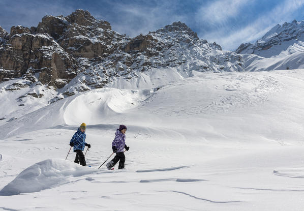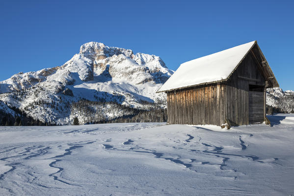 San Vigilio di Marebbe, Fanes, Dolomites, South Tyrol, Italy, Europe. Alpine hut on Fanes with the peak of Furcia dai Fers