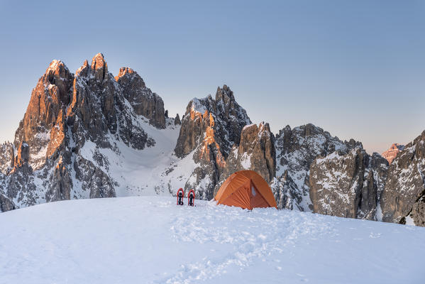 Mount Campedelle, Misurina, Auronzo di Cadore, province of Belluno, Veneto, Italy, Europe. Sunrise over the Cadini di Misurina mountains