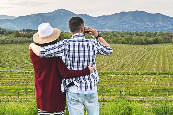 Vineyards of Franciacorta at sunset in Spring season, Lombardy district, Italy, Europe