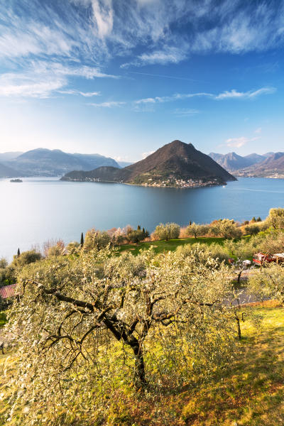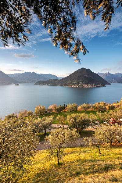Monte Isola view at sunset from Sulzano, Brescia province, Italy, Lombardy district, Europe
