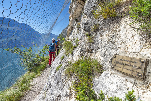 Pregasina, Riva del Garda, Lake Garda, Trento province, Trentino Alto Adige, Italy, Europe. Climbers on the "Via dei Contrabbandieri" (also named Via Torti) high above the Garda Lake