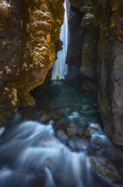 Man into a cave in front of a waterfall, Gljufrafoss, Skógar, Iceland, Northern Europe