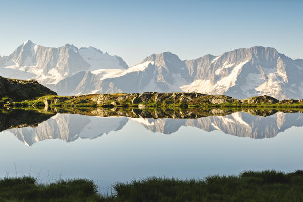 Presanella group in the mirror, dawn from the lakes of Strino, Val di Sole, Trentino Alto Adige, Italy