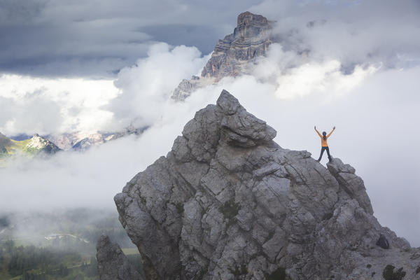 a climber stands on a peak looking at the Mount Pelmo going out of the clouds, Belluno province, Veneto, Italy