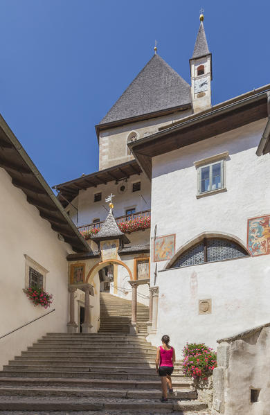 Tourist visits San Romedio monastery, Sanzeno, Predaia, Non valley, Trento province, Trentino Alto Adige, Italy, Europe (MR)