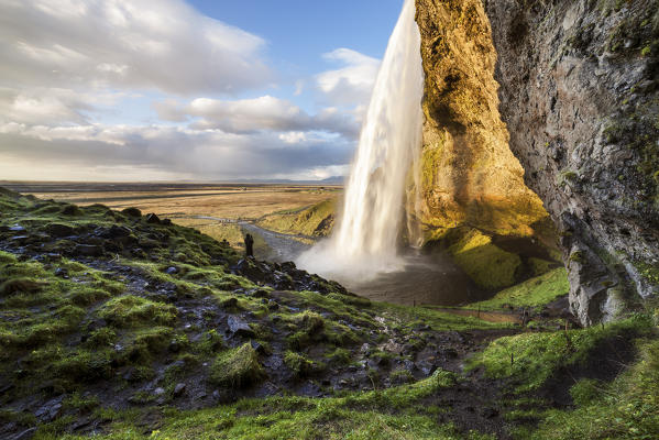 A man observes Seljalandsfoss waterfall, Skógar, Iceland, Northern Europe