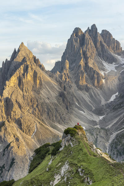 Mount Campedelle, Misurina, Auronzo di Cadore, province of Belluno, Veneto, Italy, Europe. A mountaineer admires the sunset in the Cadini di Misurina mountains