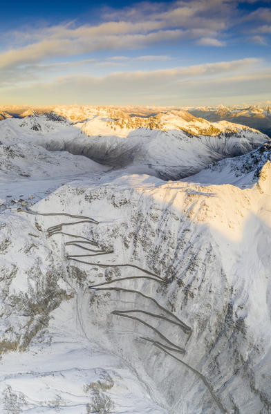 Aerial panoramic of the Stelvio Pass road covered with snow at dawn, Bolzano province, South Tyrol side, Italy