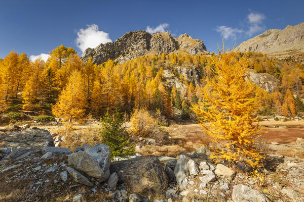 Larches in Autumn time, Preda Rossa, Val Masino, Valtellina, Sondrio province, Lombardy, Italy, Europe