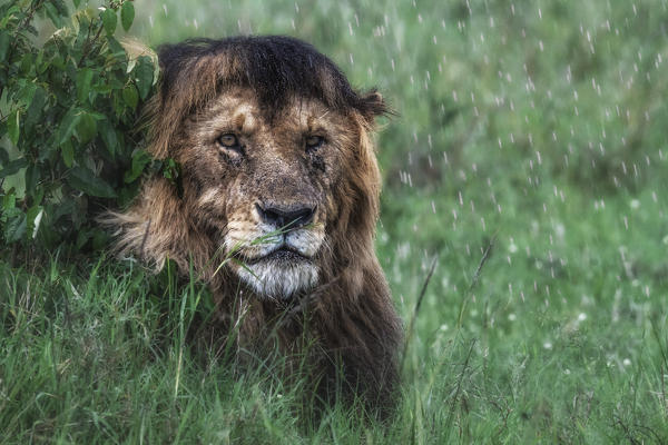 Lion in the rain (panthera leo) in the maasaimara national reserve, kenya