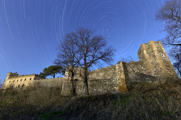 Lunar halo over the keep of the Scaliger castle of Villafranca di Verona. Verona province, Veneto, Europe, Italy.