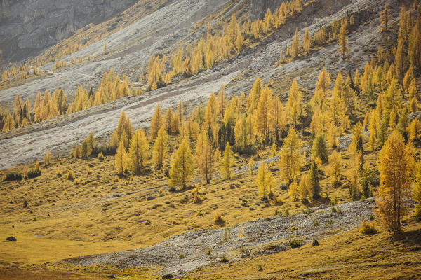 Italy,Veneto,Belluno district,Cortina d'Ampezzo,shining autumn larch trees come on struck by the sun's rays
