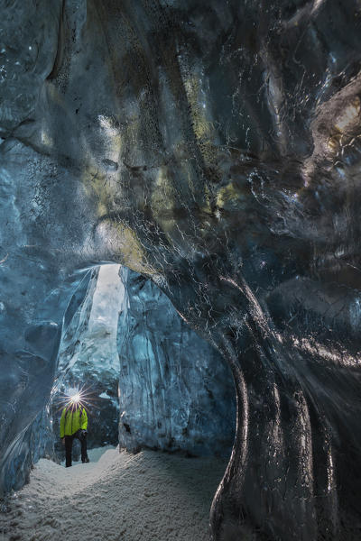 Man stands in an ice cave of Breidamerkurjokull, Austurland, Iceland, Northern Europe