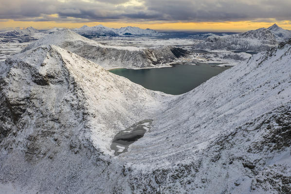 Aerial view of Uttakleiv and Haukland beach at sunrise, Leknes, Lofoten, Nordland, Norway, Scandinavia, Northern Europe
