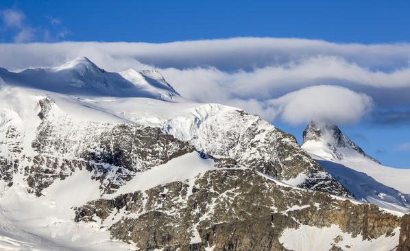 Aerial view of Piz Bernina and its glacier with a huge serac in Engadine, Switzerland Europe