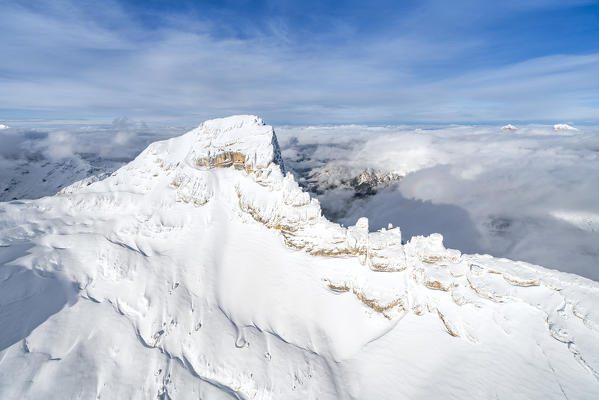 Sun shining over Monte Pelmo in winter, aerial view, Dolomites, Belluno province, Veneto, Italy