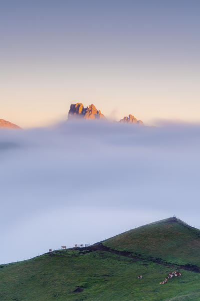 Sunrise over Sassopiatto emerging from mist, aerial view, Dolomites, Trentino-Alto Adige, Italy