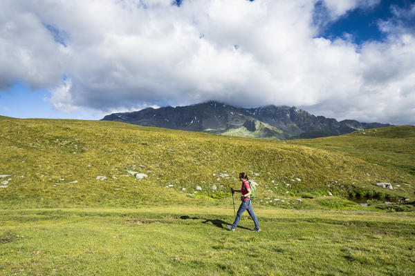 Side view of woman with hiking poles walking towards Pian dei Cavalli, Vallespluga, Valchiavenna, Valtellina, Lombardy, Italy