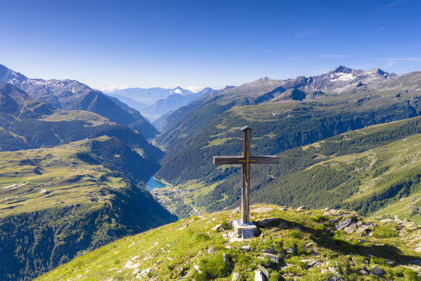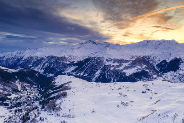 Aerial view of green woods surrounding Chiavenna and Madesimo from Mount Cardine, Valchiavenna, Valtellina, Lombardy, Italy