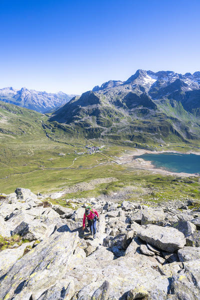 Hiker woman uphill on rocks towards Mount Cardine with lake Montespluga on background, Valchiavenna, Valtellina, Lombardy, Italy