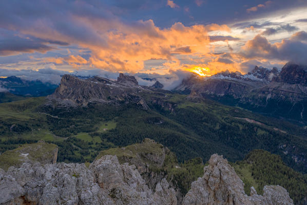 Aerial panoramic of Cortina d'Ampezzo and Tofane mountains surrounded by green woods, Dolomites, Belluno, Veneto, Italy