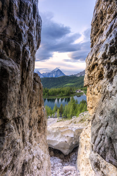 Dusk over Becco di Mezzodi and hut on shores of Lake Federa, Ampezzo Dolomites, Belluno province, Veneto, Italy