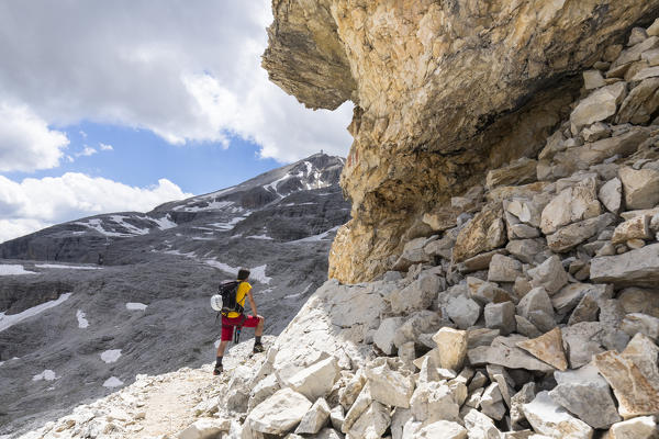 A hiker along the alpine path to the Piz Boè in the background on the Sella Group, Bolzano province, South Tyrol, Trentino Alto Adige, Italy