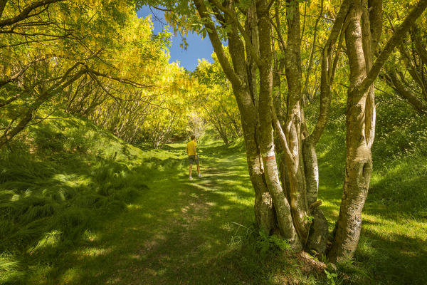 Hiker walks in the biggest Laburnum forest (Laburnum Anagyroides) of Europe, Generoso mount, Intelvi valley, Como province, Lombardy, Italy, Europe (MR)