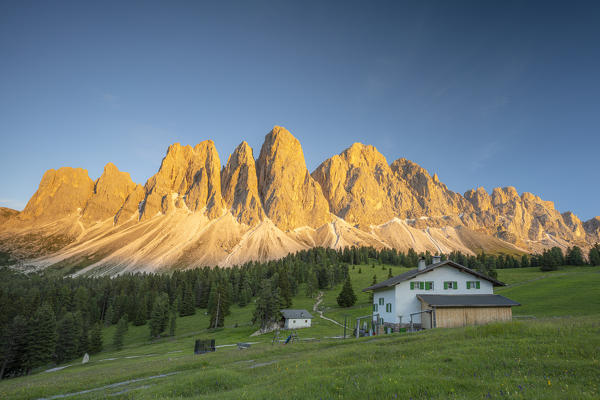Sunset over Sass Rigais, Furchetta and Odle peaks seen from Glatsch Alm hut, Val di Funes, South Tyrol, Dolomites, Italy