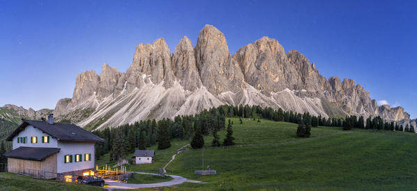 Panoramic of the Odle at dusk seen from Glatsch Alm hut, Val di Funes, South Tyrol, Bolzano province, Dolomites, Italy
