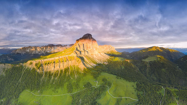 Cloudy sky at sunrise over Sass De Putia and Odle di Eores, Passo Delle Erbe (Wurzjoch), Dolomites, South Tyrol, Italy