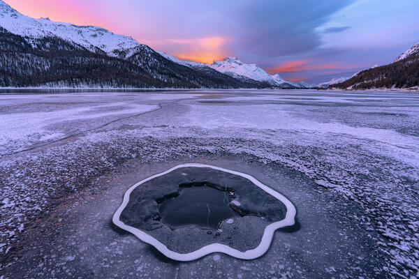 Winter sunrise over the snow capped Piz Da La Margna and frozen Lake Sils, canton of Graubunden, Engadine, Switzerland