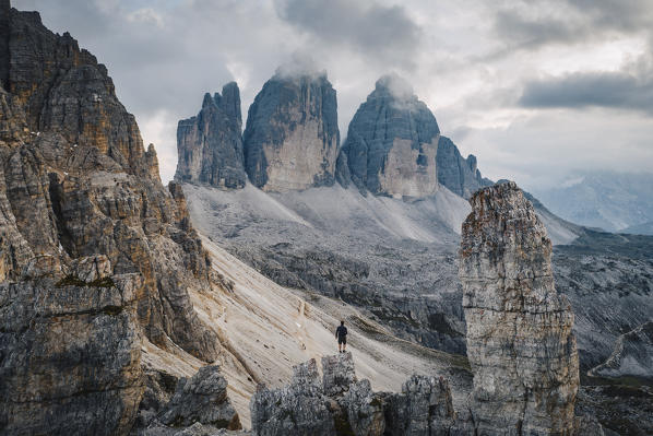 A photographer taking pictures into Dolomites. Lavaredo Three peaks, Bolzano province, South Tyrol, Italy.