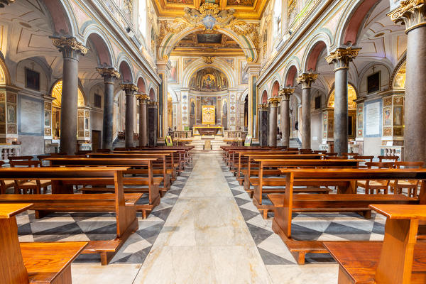 The interior of the Basilica of San Bartolomeo all'Isola on the Tiber Island. Italy, Lazio, Province of Rome, Rome.