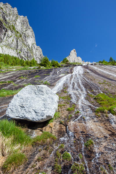 A creek flowing on some granitic plate at the feet of Picco Luigi Amedeo, Valmasino. Valtellina Lombardy Italy Europe