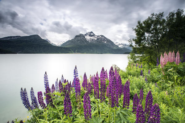 Blossoming of lupin on the shores of lake Sils with Piz la Margna in the background.Sils,Engadine,Canton of Graubunden,Switzerland Europe