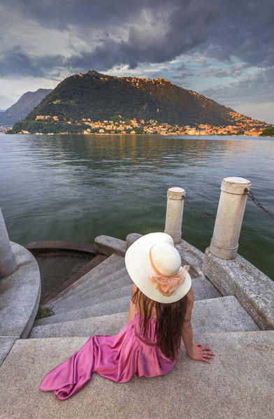 A tourist walks and visit Nesso village in the Autumn, lake Como, Como province, Lombardy, Italy, Europe (MR)